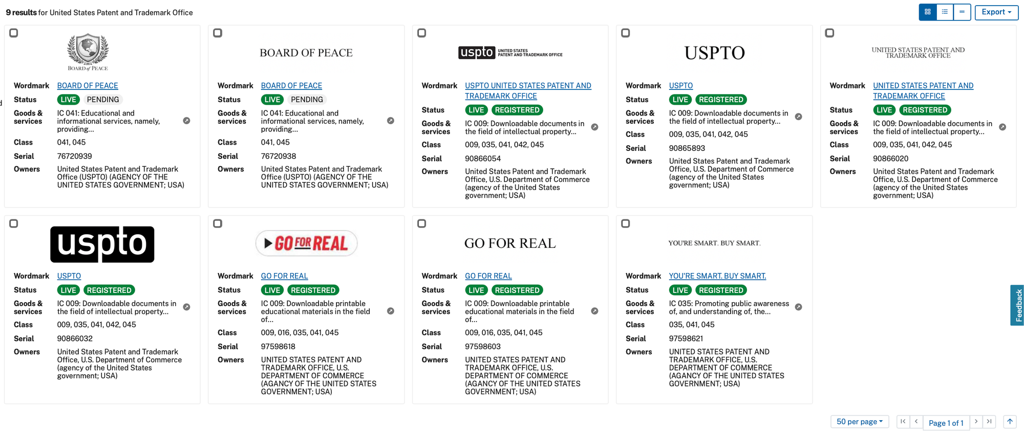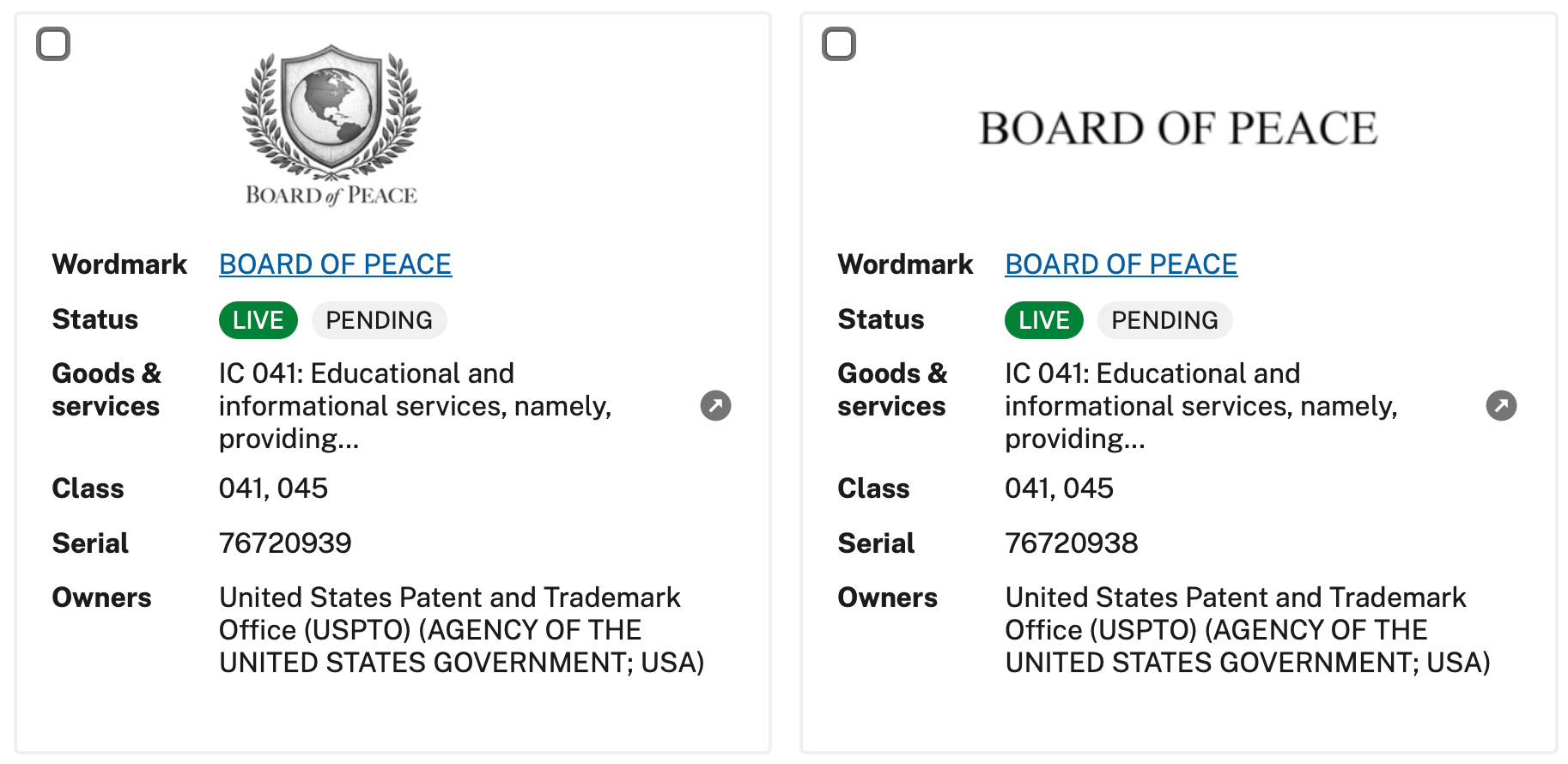 Two trademark applications, one filed on December 30, 2025 for the “Board of Peace” name, and another on January 21, 2026 for its logo graphic, list the United States Patent and Trademark Office as owner. USPTO owns only seven other trademarks, and all of them are for USPTO-specific names and logos. Three of them focus on a 2020 USPTO program designed to raise public awareness of counterfeit goods, with marks filed for “Go For Real,” and “You're Smart. Buy Smart.”