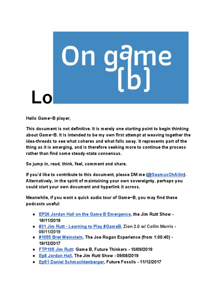 Of course, actually talking about Game B was fraught with hazards; as it didn't yet exist and was perpetually a work in progress, it carried a characteristic of all utopian schemes — a concern to not saddle it with the baggage and verbiage of the old ways. As Jordan Hall put it, “Game B is notoriously difficult to think and talk about for the very good reason that if you were using the conceptual structures that came out of Game A to do so, you may very well be poisoning the well.”